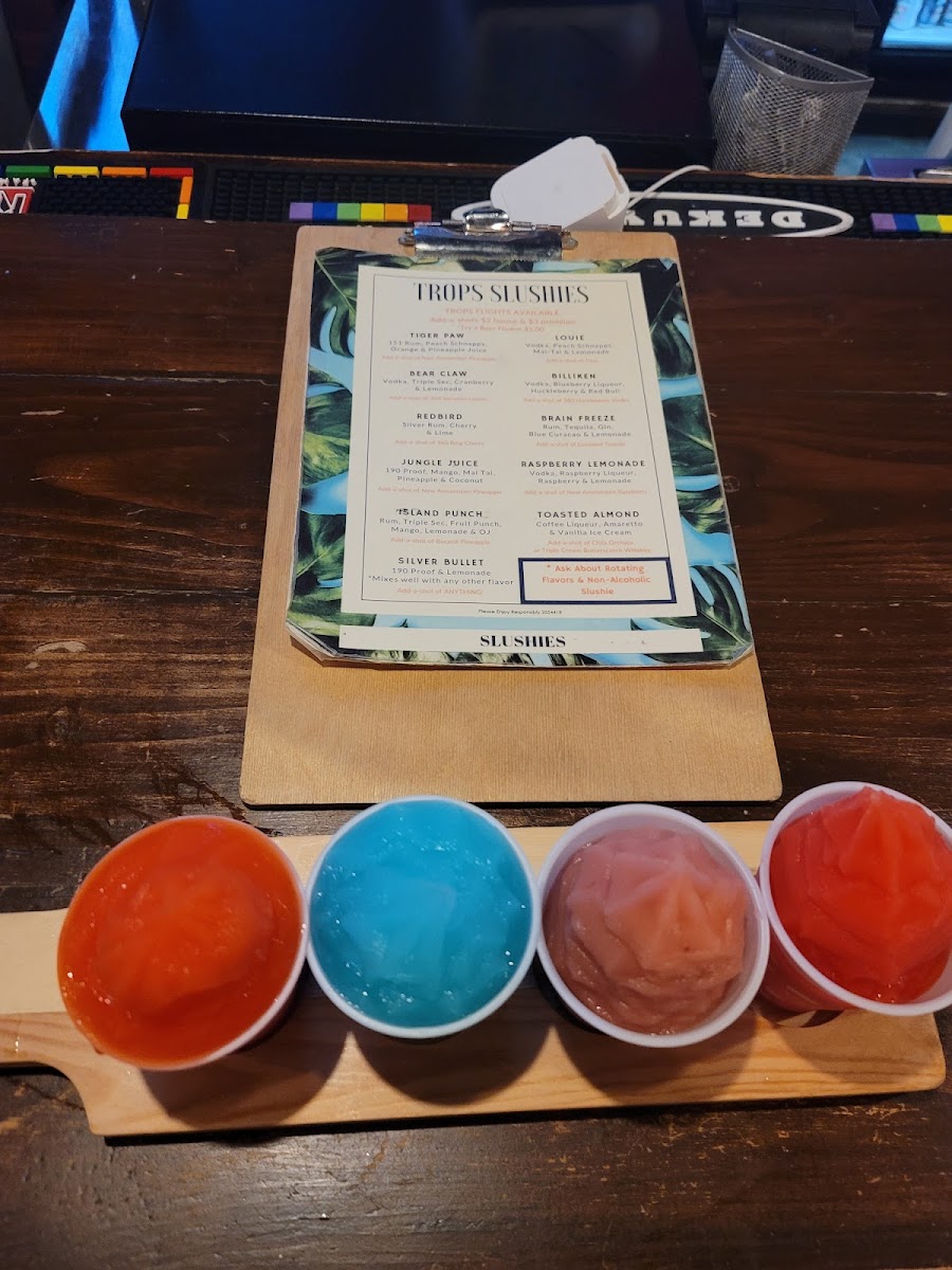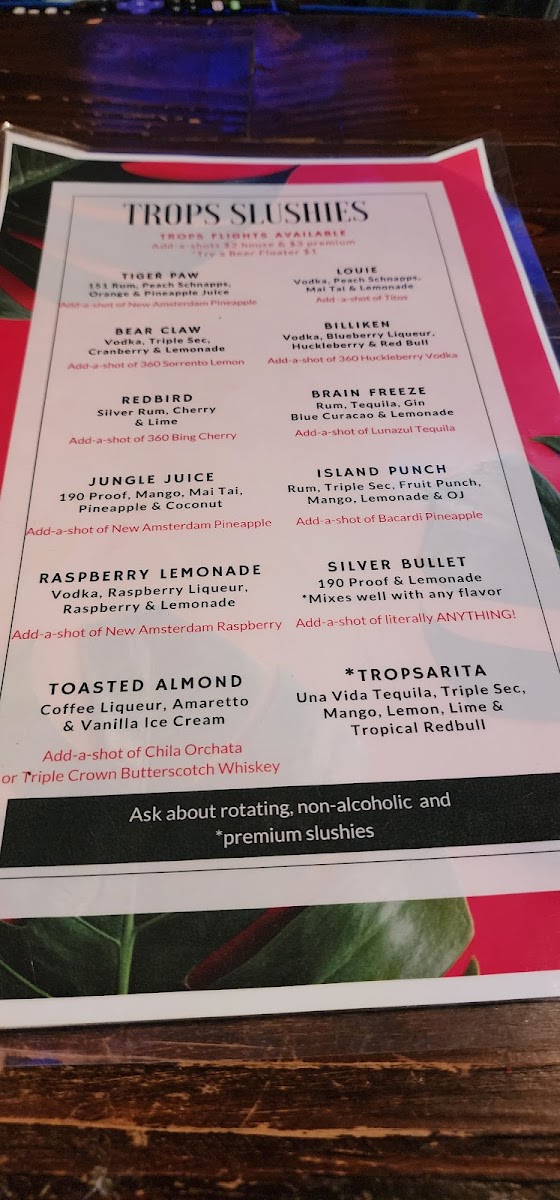 Welcome to Tropical Liqueurs - St. Louis, your go-to destination for vibrant flavors and a lively atmosphere. Nestled at 4104 Manchester Ave, this popular hangout is known for its eclectic menu featuring delicious Trops Slushies that blend unique spirits with refreshing fruit juices. Indulge in tempting flavors like the Tiger Paw, combining 151 Rum with a citrus twist, or the invigorating Bear Claw that harmonizes vodka with cranberry and lemonade.